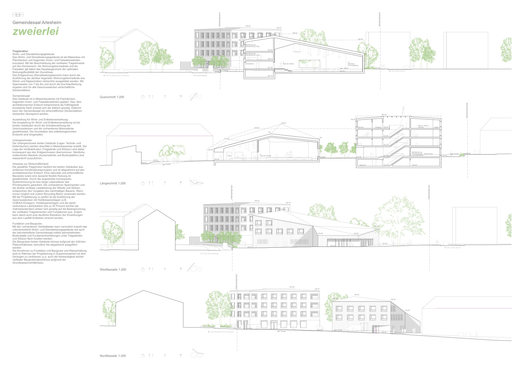 Der publikumsbezogene Gemeindesaal wird als zentraler Baukörper zwischen dem westlich gelegenen Pfeffingerhof und dem neuen, östlich liegenden Wohngebäude positioniert.